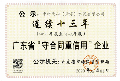 近日,中材天山(云浮)被广东省市场监督管理局评为“广东省守合同重信用企业”,这是企业连续十三年获此荣誉称号。
