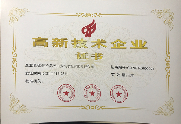 2021年12月,阿克苏天山公司荣获国家“高新技术企业”荣誉称号,这标志这公司高质量发展再次迈上新台阶。