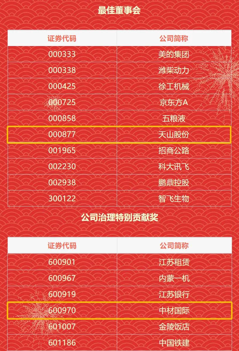 2022年4月6日,《董事会》杂志正式发布第十七届中国上市公司董事会“金圆桌奖”获奖名单,中国建材股份所属天山股份荣获“最佳董事会”,中材国际荣获“公司治理特别贡献奖”。
